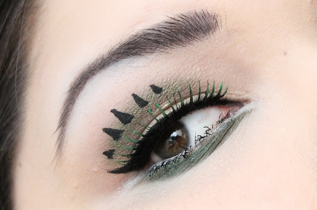 Das untere Lid wollte ich "runterziehen". Schaut man genauer hin, sieht man das auch bei der "bösen" Hexe. Ich schuf also erst einmal mit MAC's "Mystery" einen tiefen Schatten und mit "Humid" und einem knalligeren grün Ton aus der 120er-Palette malte ich mir sozusagen einen Lidstrich auf das untere Lid, welches bei mir ja nicht wirklich vorhanden ist. Ich trennte sie mit dem NYX Jumboeyepencil in "Milk" (aus dem selben Grund wie oben genannt), in dem ich wieder die Wasserlinie weißte und dieses mal auch etwas mehr rauszog, damit man den Bogen des unteren Lidstrichs noch mehr erkennt.